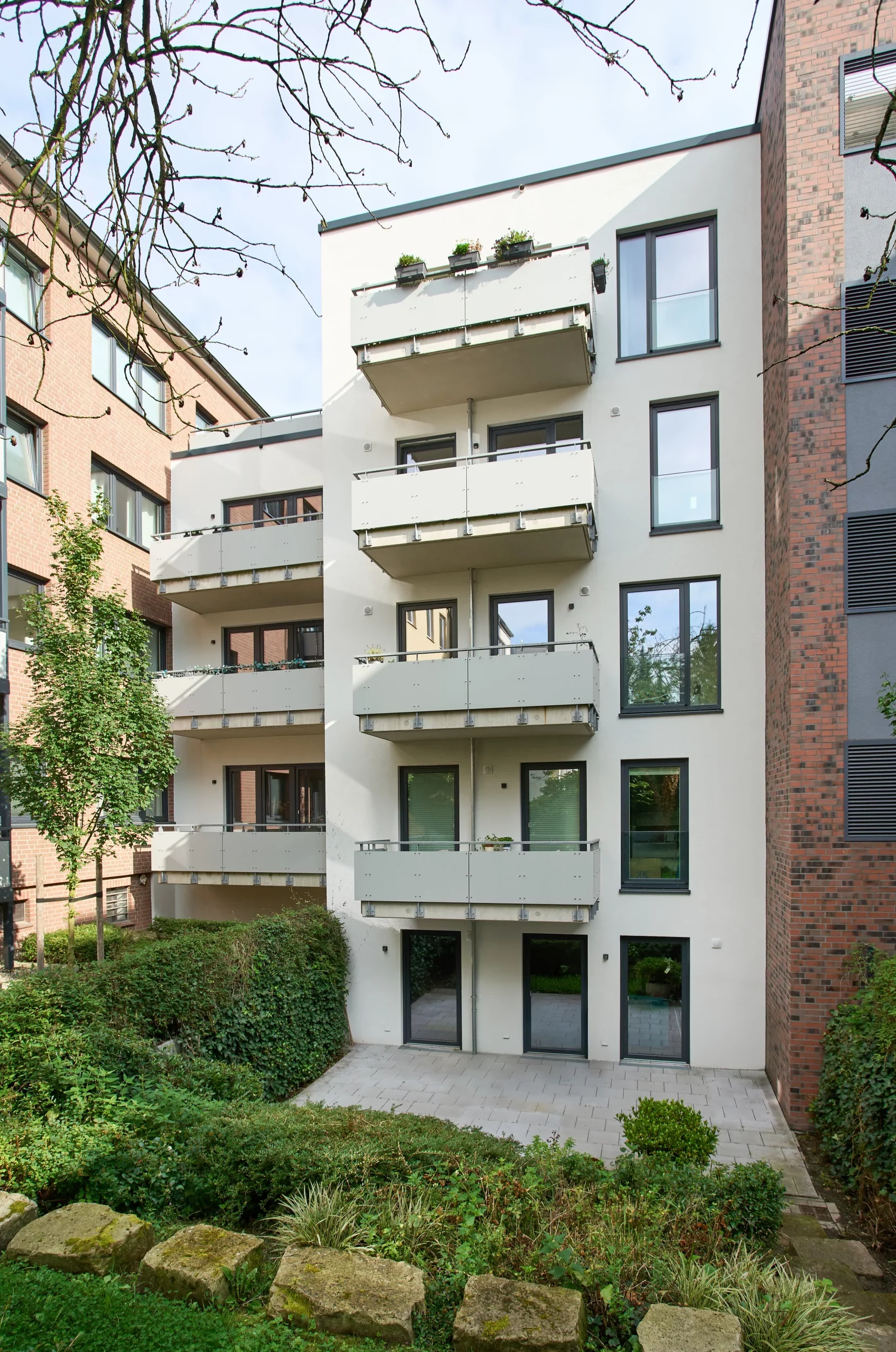 Entstanden sind 16 hochwertige Mietwohnungen mit überwiegender Ausrichtung zum grünen Innenhof. Hochwertige Außenanlagen vervollständigen das Bild.